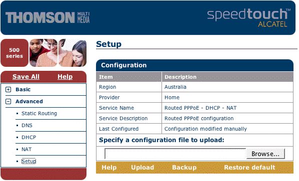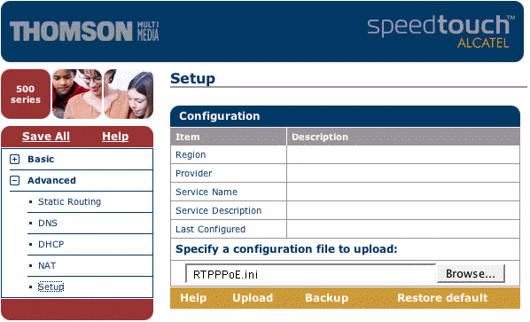 Click on "Browse" and browse to the folder with the ini files inside and select a new ini file to upload. The file will appear in the above window. The one shown is an "RTPPPoE.ini" that configures the 510 as a PPPoE DHCP ROUTER.